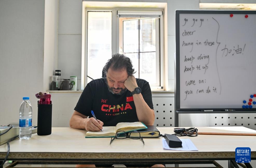 塞奥哈里斯在泳池边做笔记(4月24日摄)。新华社记者 孙凡越 摄
