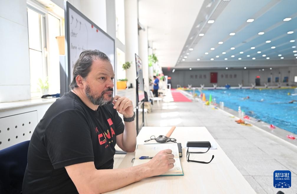 塞奥哈里斯在泳池边观看球员训练并做笔记(4月24日摄)。新华社记者 孙凡越 摄