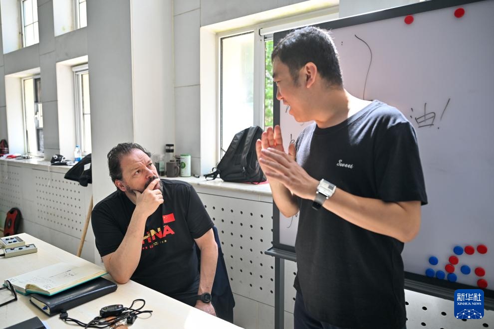 塞奥哈里斯(左)与翻译王鹏宇交流(4月24日摄)。新华社记者 孙凡越 摄
