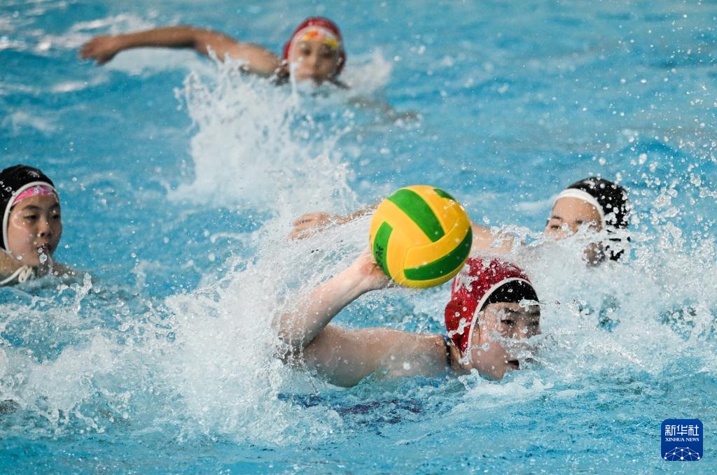天津女子水球队助理教练兼球员孙雅婷(右下)在训练中(4月24日摄)。新华社记者 孙凡越 摄