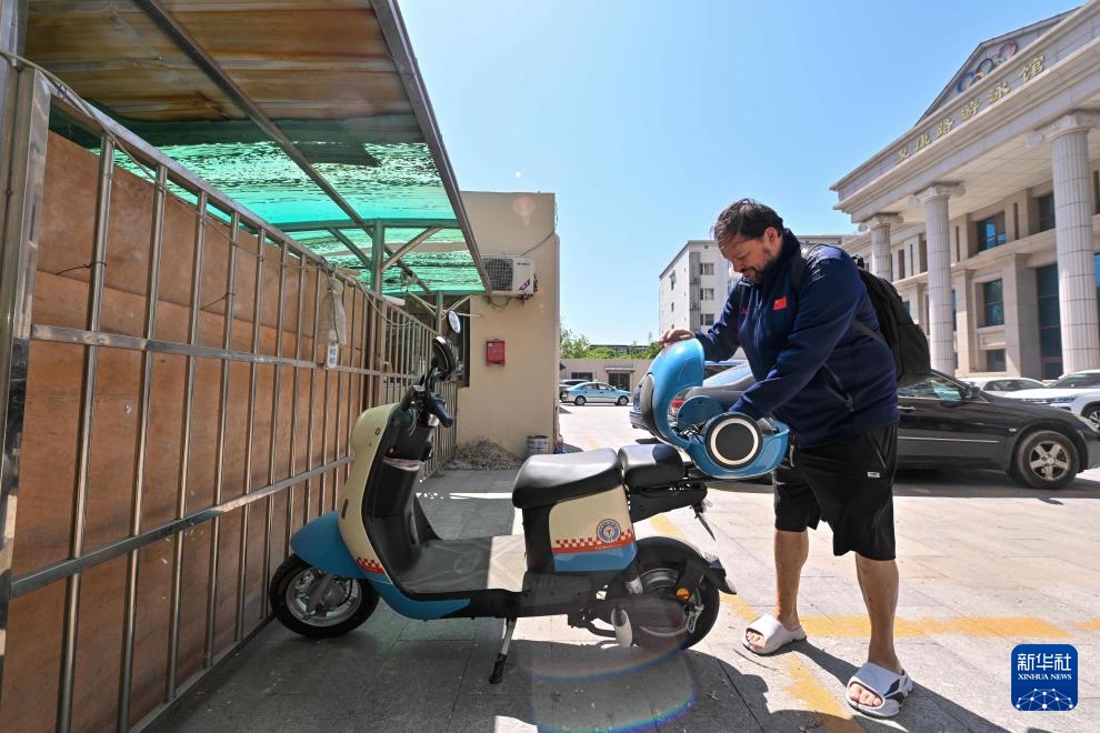 塞奥哈里斯准备骑电动车离开训练场馆(4月24日摄)。新华社记者 孙凡越 摄