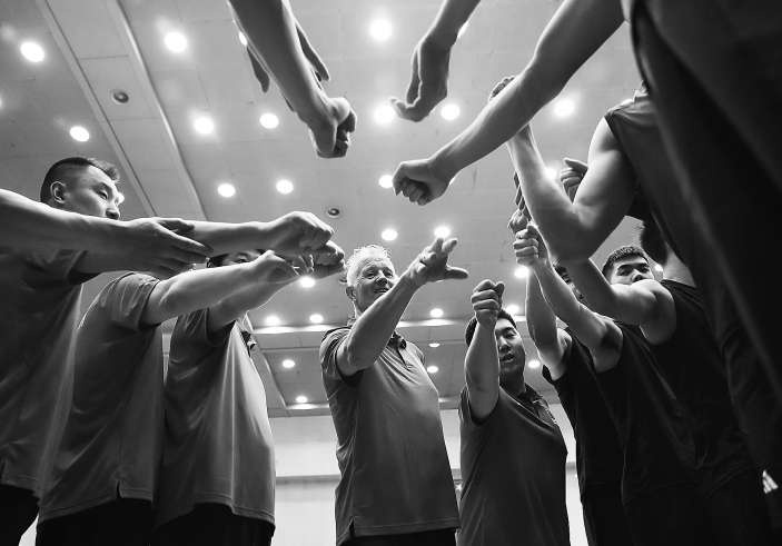 海宁(中)带领全队加油鼓劲。本报记者 刘平摄