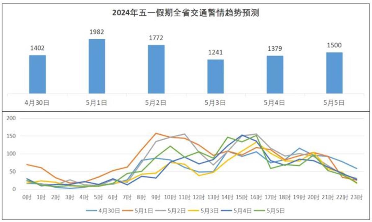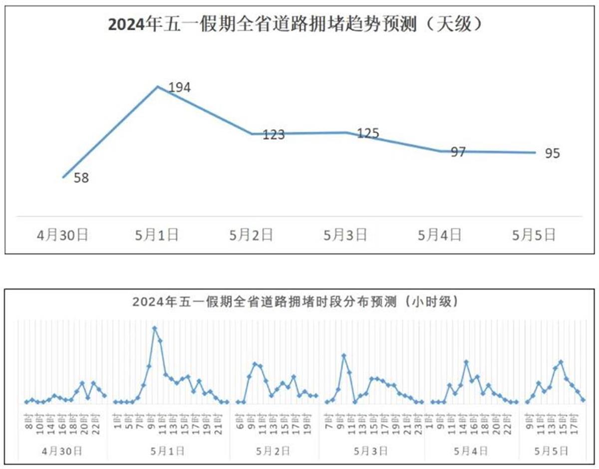 预计4月30日16-21时将出现第一波出行小高峰。5月1日至3日上午8时至10时为出行高峰时段。5月4日至5日下午1时至16时,返程高峰拥堵趋势明显。