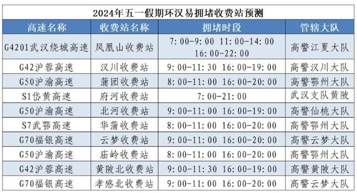 沪渝、沪蓉、福银、京港澳、武鄂、武汉绕城、二广、沪武、关豹、大广、岱黄、杭瑞等高速公路拥堵风险高。
