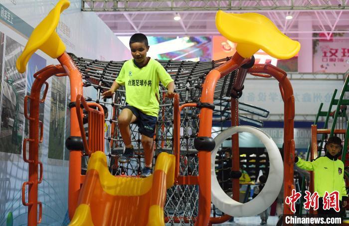图为一名足球“小将”体验体育产品。中新网记者 孙亭文 摄