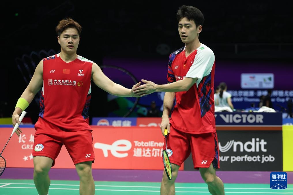 4月28日,中国队组合梁伟铿/王昶(右)在男双比赛中。他们2比0战胜加拿大队组合凯文·李/亚历山大·林德曼。新华社记者 陈斌 摄
