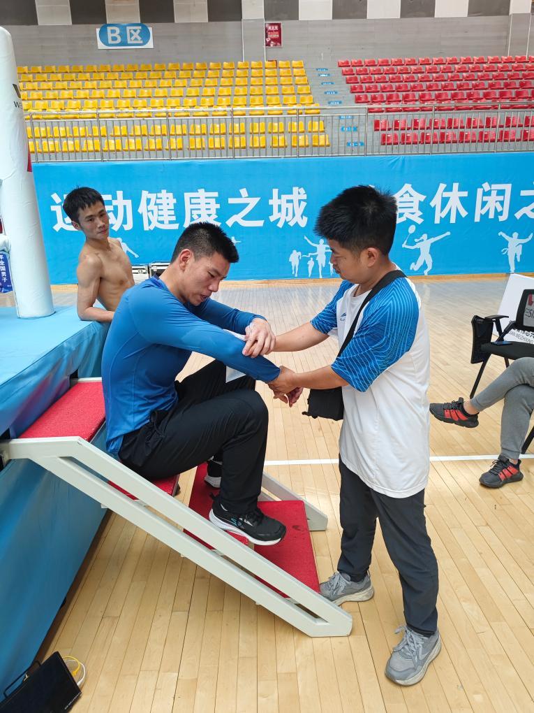 ↑重庆市拳击专业队队医许荣清(右)在检查运动员受伤情况