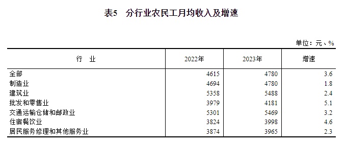 分行业看,六大行业收入均保持增长。从事制造业农民工月均收入4780元,增长1.8%;从事建筑业农民工月均收入5488元,增长2.4%;从事批发和零售业农民工月均收入4181元,增长5.1%;从事交通运输仓储和邮政业农民工月均收入5469元,增长3.2%;从事住宿餐饮业农民工月均收入3998元,增长4.6%;从事居民服务修理和其他服务业农民工月均收入3965元,增长2.3%。