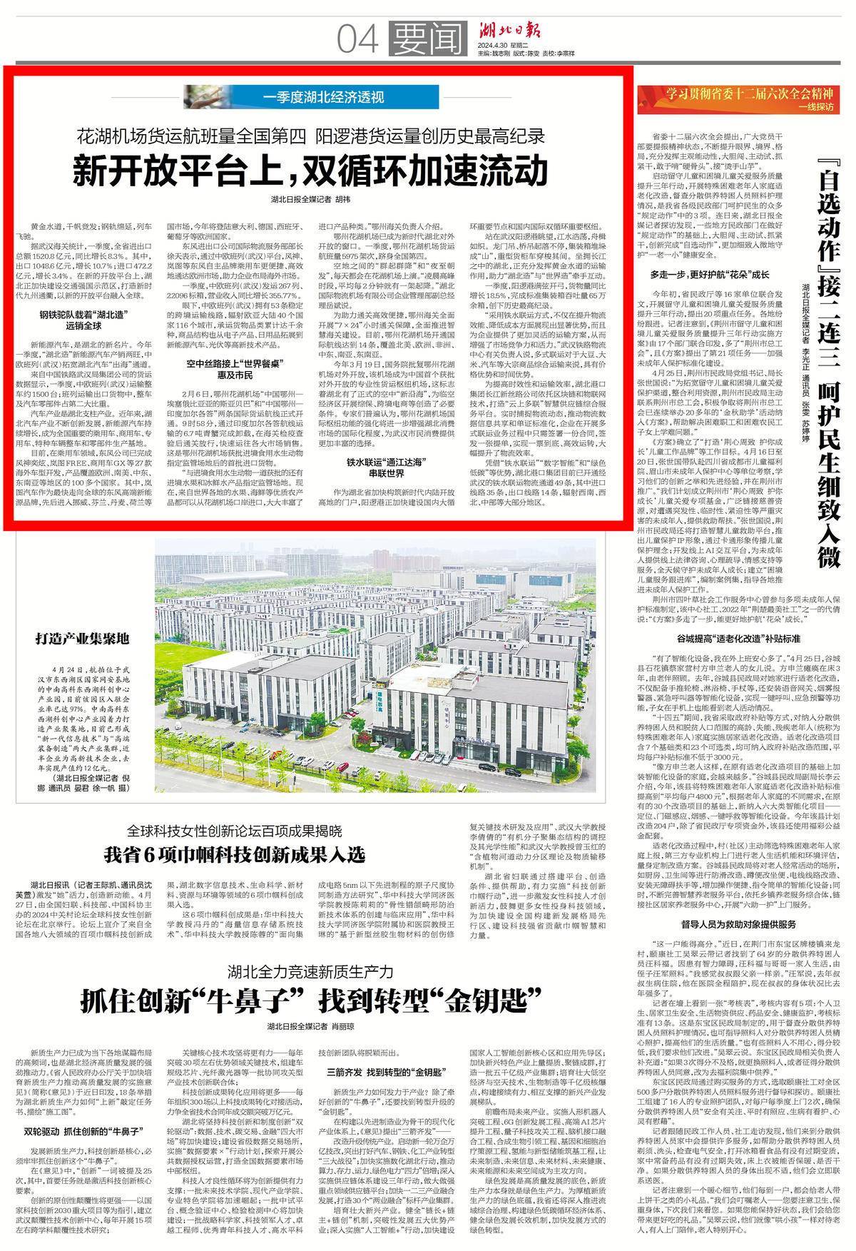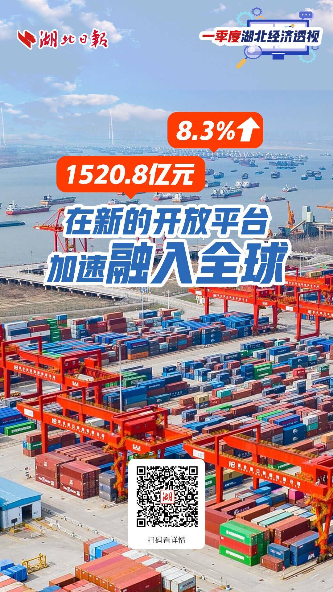 据武汉海关统计,一季度,全省进出口总额1520.8亿元,同比增长8.3%。其中,出口1048.6亿元,增长10.7%;进口472.2亿元,增长3.4%。在新的开放平台上,湖北正加快建设交通强国示范区,打造新时代九州通衢,以新的开放平台融入全球。