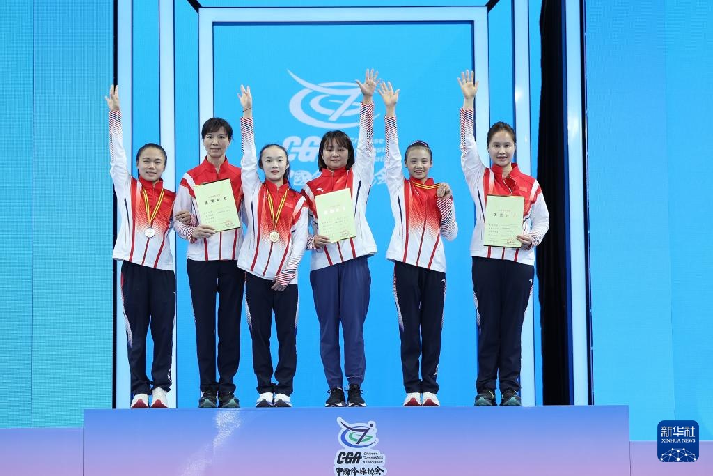4月29日,冠军湖南队选手周雅琴(左三)与教练何花(右三)、亚军浙江队选手张清颖(左一)与教练徐惊雷(左二)、季军福建队选手邱祺缘(右二)与教练孙萍在颁奖仪式上合影。新华社记者 曹灿 摄