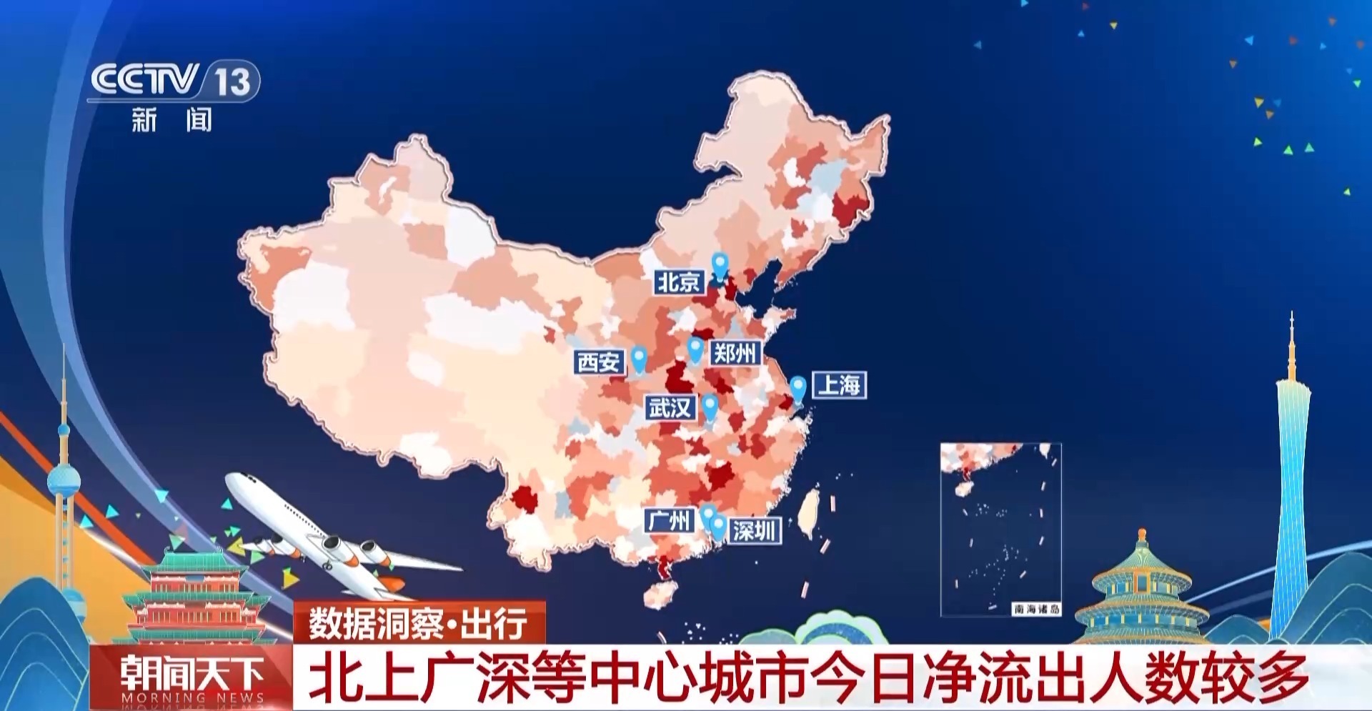 这是一张根据12306火车票预售数据绘制的热力图,红色越深代表在今天乘火车净流入到这个城市的人越多,蓝色越深则表示净流出这里的人越多。北上广深、武汉、郑州、西安等中心城市是净流出人数较多的城市。