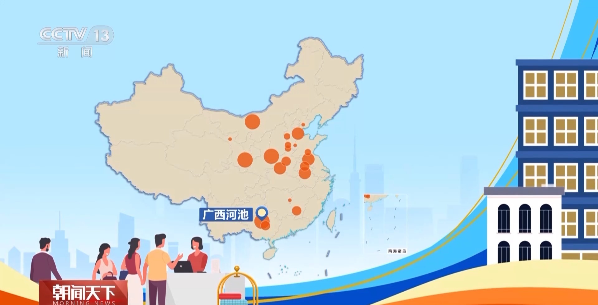 在这张热力图上,标注的是增幅前20的小众目的地城市,圆圈大小表示增幅的高低,排名第一的广西河池的酒店和票务预订同比增长近四倍,而分布在10个不同省份的这20个城市,同比增幅都在一倍以上。