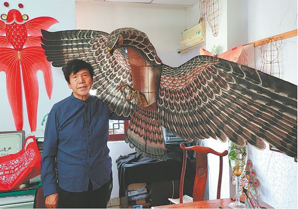 Yang Hongwei, 58, is an inheritor of kite-making techniques in Weifang, Shandong province. CHINA DAILY