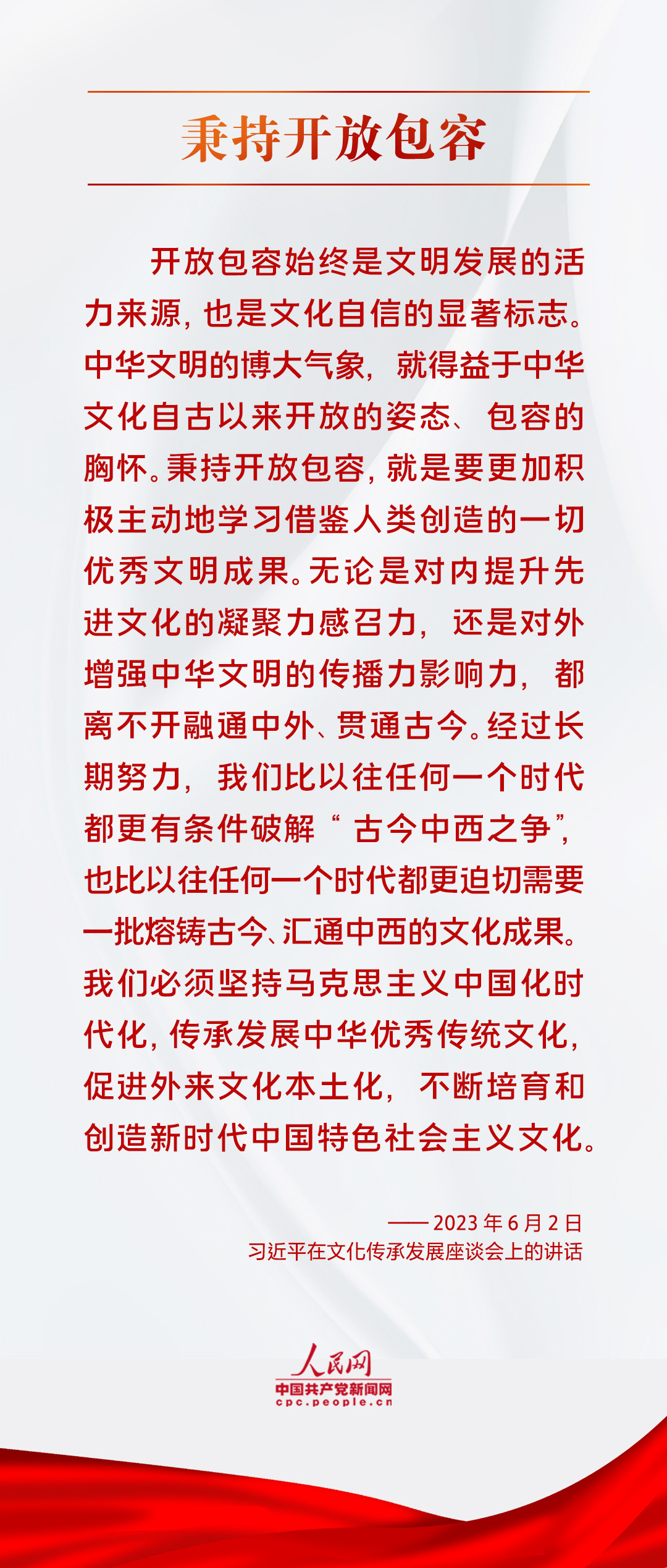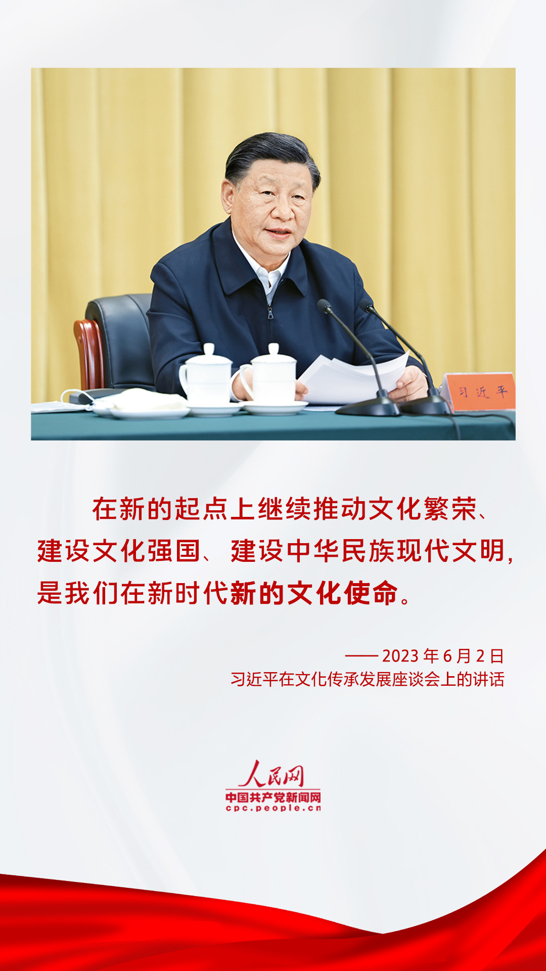 “当代中国共产党人和中国人民应该而且一定能够担负起新的文化使命,在实践创造中进行文化创造,在历史进步中实现文化进步!”