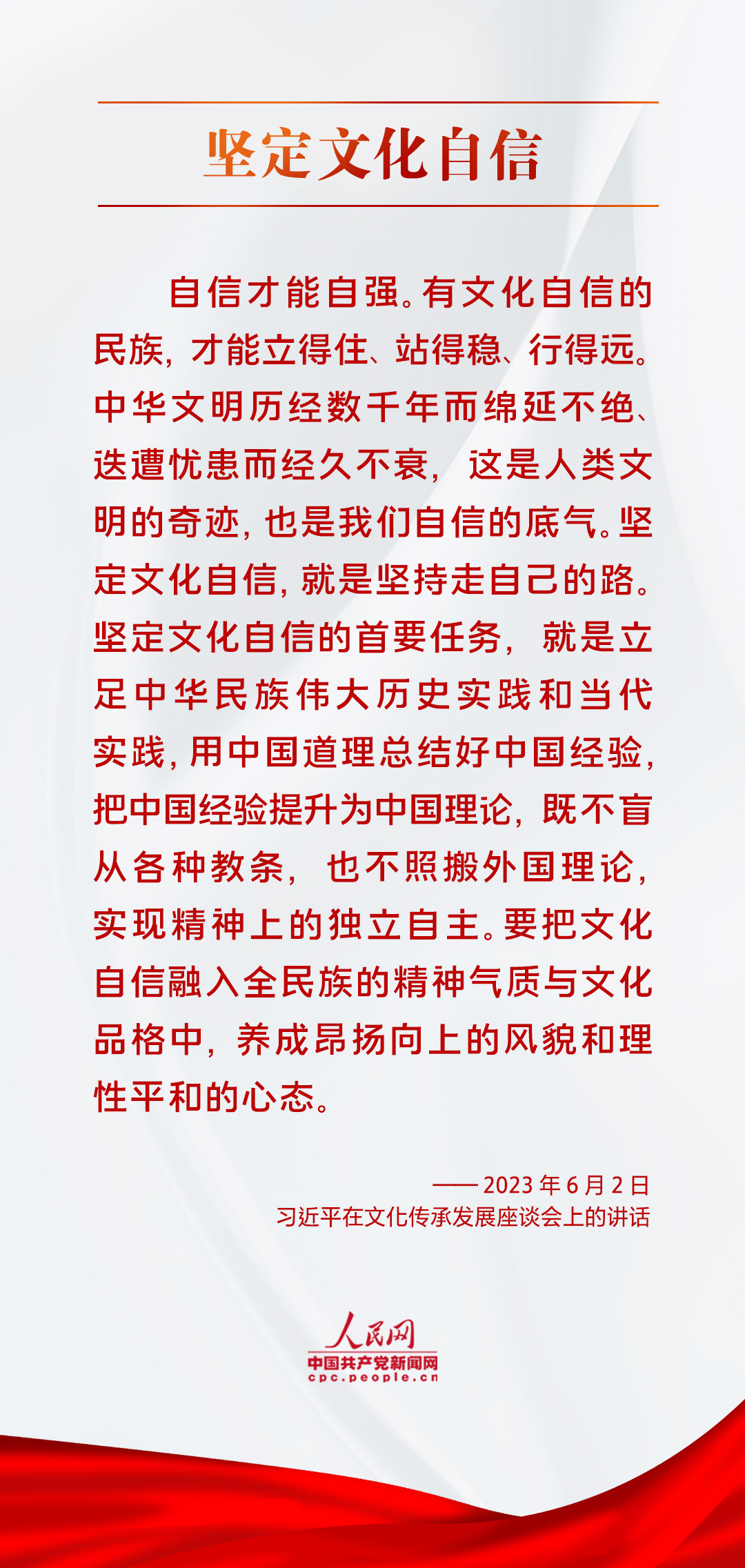 更好担负起新的文化使命,首先必须坚定文化自信。文化自信是更基础、更广泛、更深厚的自信,是一个国家、一个民族发展中最基本、最深沉、最持久的力量。一个抛弃了或者背叛了自己历史文化的民族,不仅不可能发展起来,而且很可能上演一幕幕历史悲剧。有文化自信的民族,才能立得住、站得稳、行得远。中华文明历经数千年而绵延不绝、迭遭忧患而经久不衰,在长期演进过程中形成了中国人看待世界、看待社会、看待人生的独特价值体系、文化内涵和精神品质。这是我们区别于其他国家和民族的根本特征,铸就了中华民族博采众长的文化自信。当前,各种思想文化相互激荡,不同文明交流交融交锋更加频繁。坚定文化自信,必须坚持走自己的路,既不盲从各种教条,也不照搬外国理论,实现精神上的独立自主,同时把文化自信融入全民族的精神气质与文化品格中,养成昂扬向上的风貌和理性平和的心态。——《人民日报》