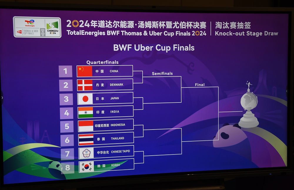 新华社成都5月1日电(记者田光雨、许仕豪、陈地)2024年汤姆斯杯暨尤伯杯赛1日结束小组赛较量。在随后进行的淘汰赛抽签中,中国男队在四分之一决赛中遭遇卫冕冠军印度队,中国女队则将迎战丹麦队。