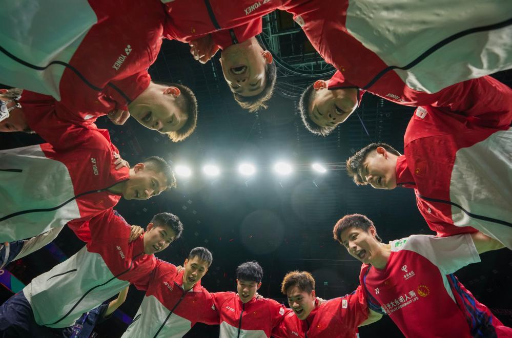 5月2日,中国队队员在汤姆斯杯羽毛球团体赛四分之一决赛赛前相互激励。新华社记者 江宏景 摄