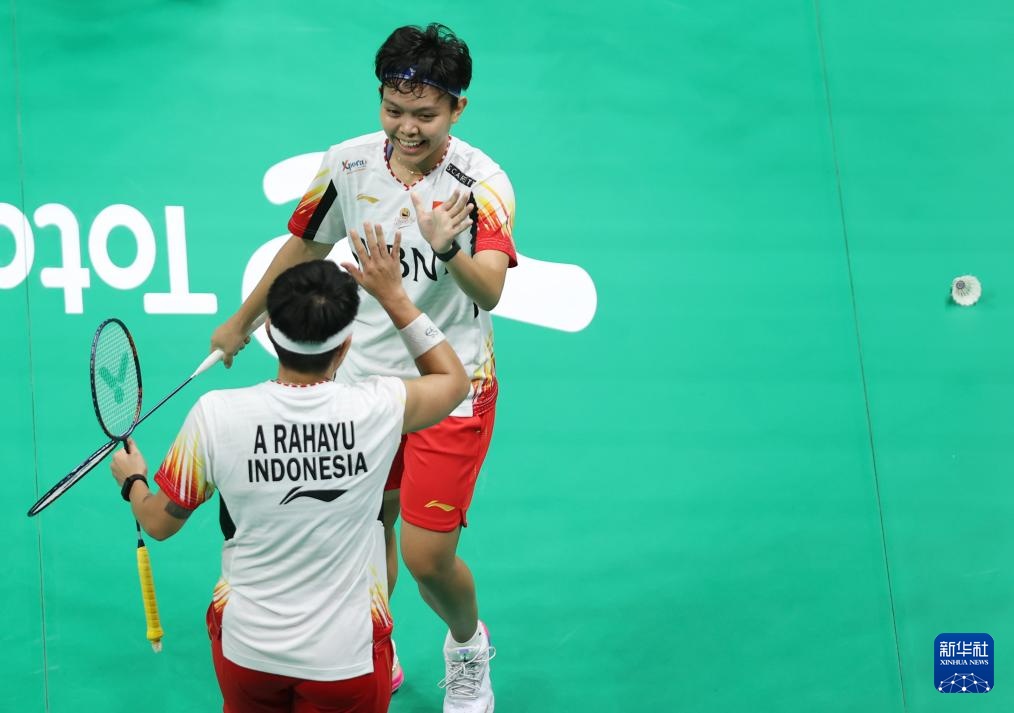 5月3日,印度尼西亚队组合拉哈尤/西蒂(上)在女子双打比赛后庆祝胜利。她们2比0战胜泰国队组合琼卡潘/拉温达。新华社记者 贾浩成 摄