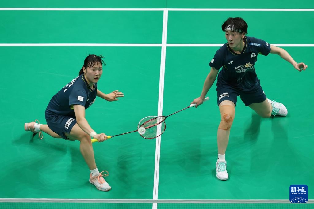 5月3日,韩国队组合白荷娜(左)/李绍希在女子双打比赛中。最终,她们2比0战胜中国台北队组合许雅晴/林琬清。新华社记者 贾浩成 摄