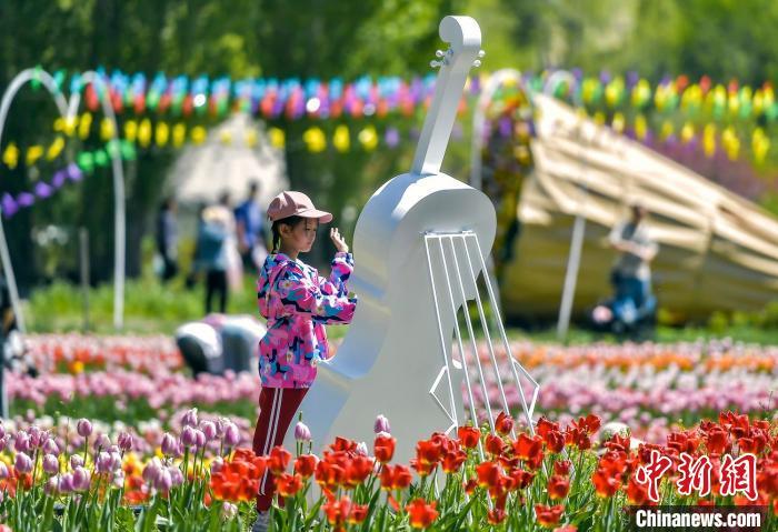 民众在盛开的郁金香花田中拍照留影。中新网记者 刘新 摄