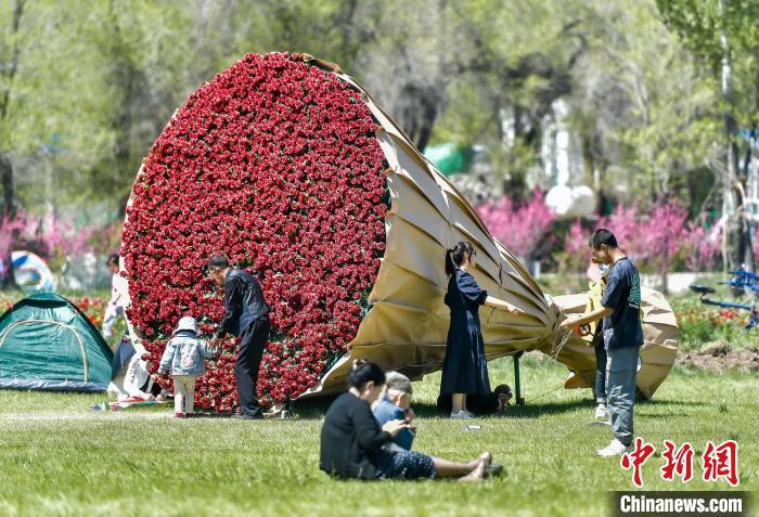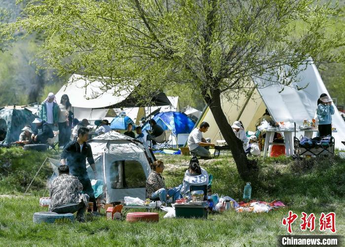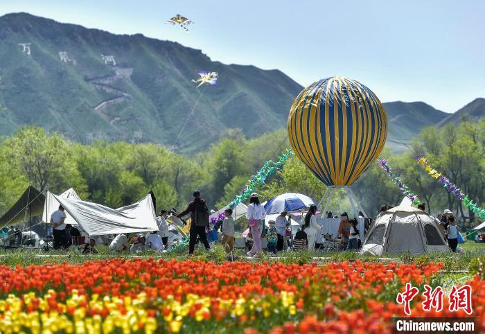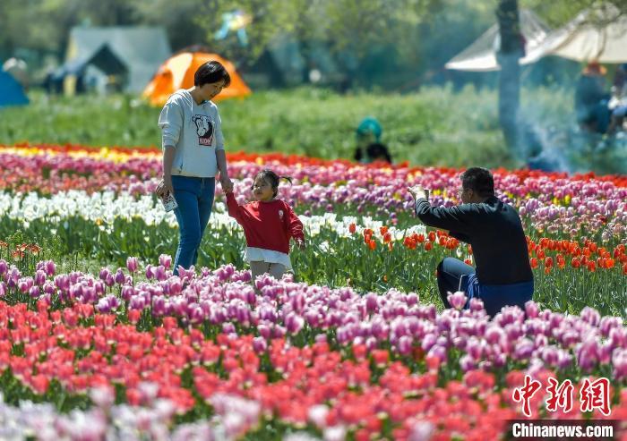 5月3日,在新疆乌鲁木齐市石人子沟红湾花海生态农场,近万株郁金香相继盛开,远远望去如同一条彩色花毯,吸引众多民众携露营装备前往,在花田边“安营扎寨”,品烧烤、赏花海,乐享假日时光。