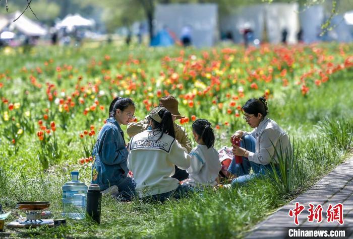 民众在盛开的郁金香花田旁野餐。中新网记者 刘新 摄