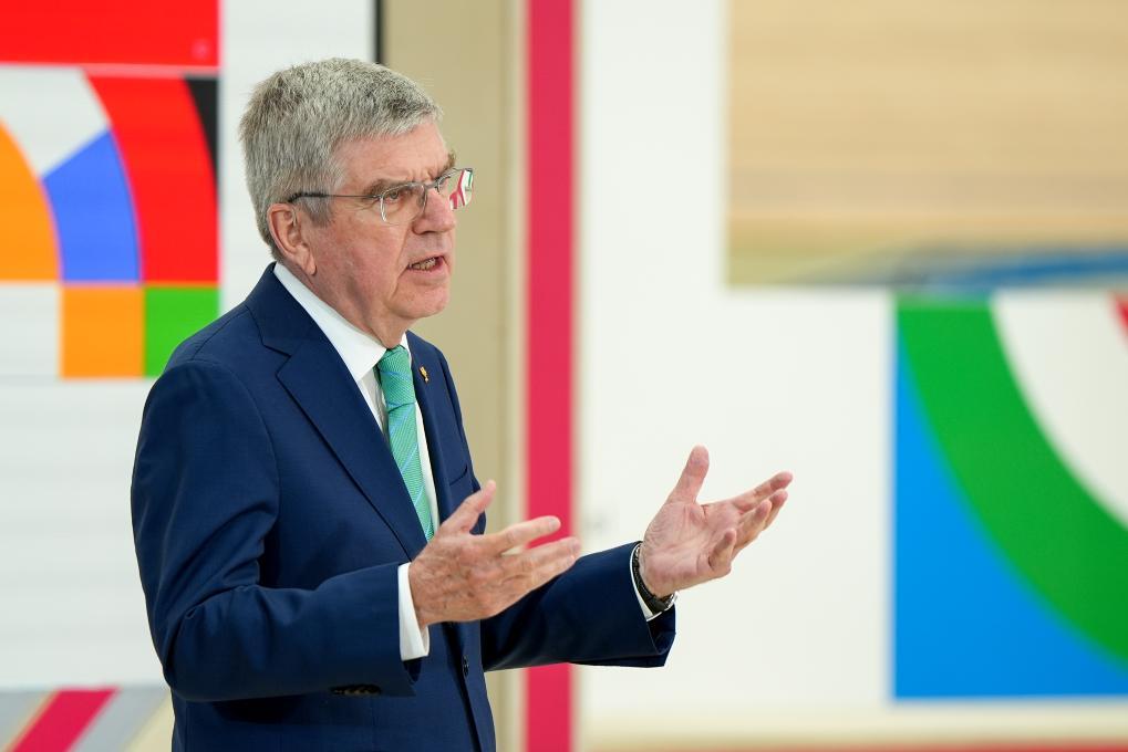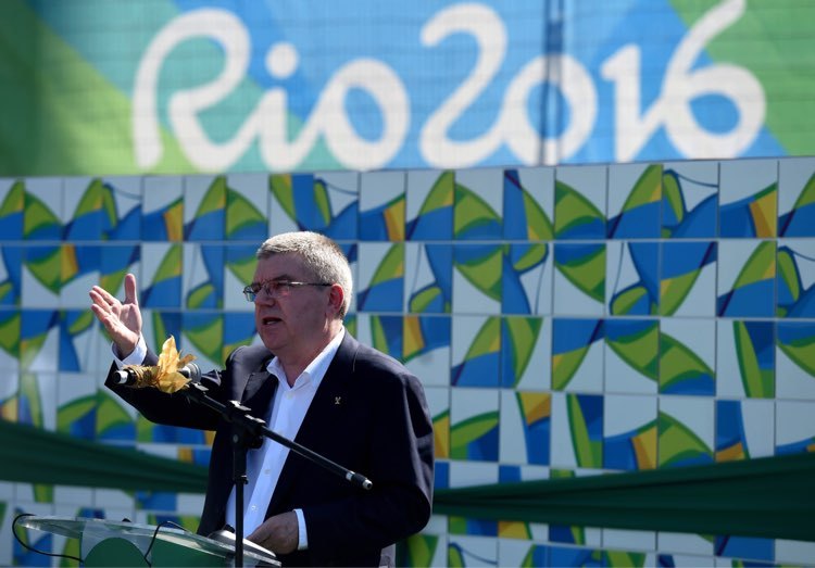 图为里约奥运村的奥林匹克休战墙揭幕时,国际奥委会主席巴赫致辞。