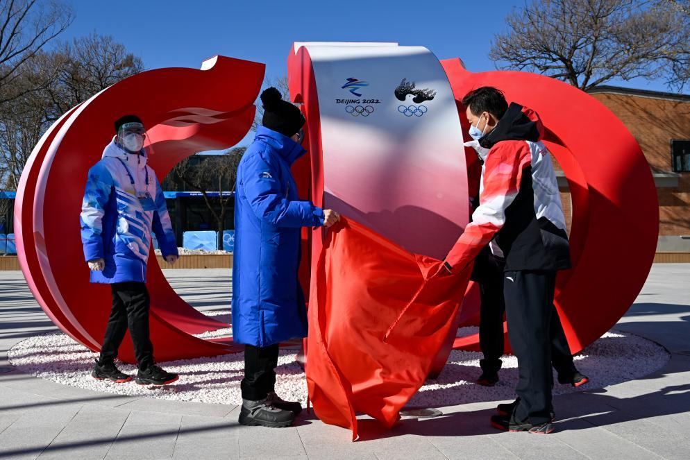 图为2022年2月1日上午,国际奥委会主席巴赫(前左)为北京冬奥村里的休战壁画揭幕。新华社/POOL/王钊