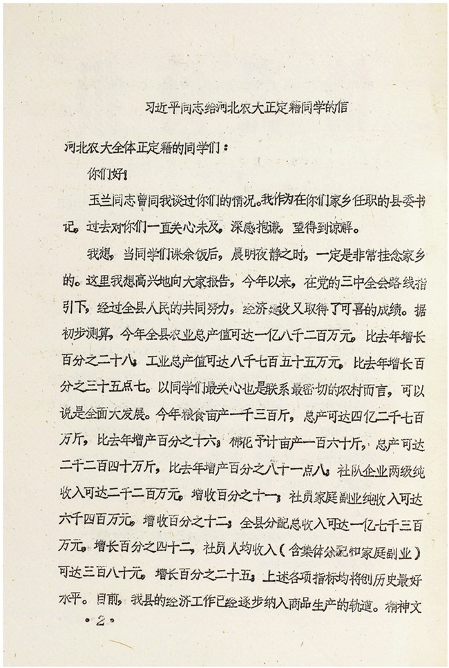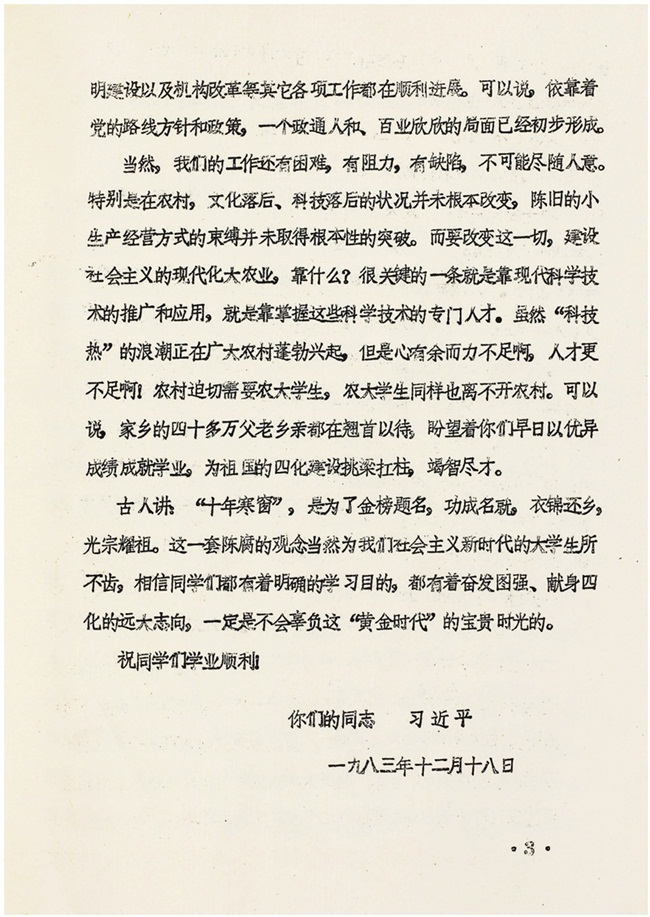 1983年,习近平写给河北农大全体正定籍学生的信。图源:《习近平在正定》