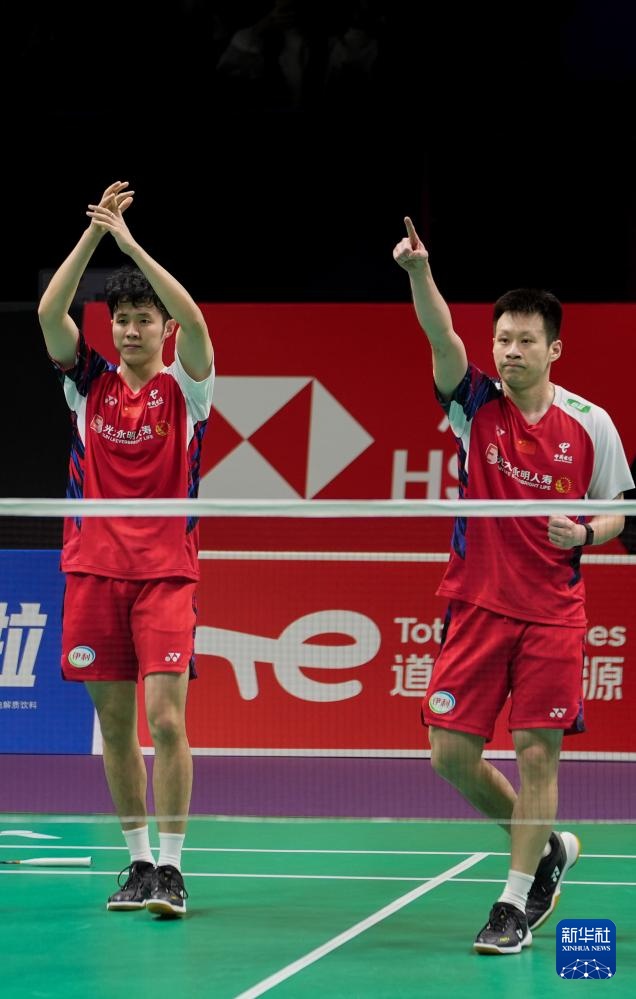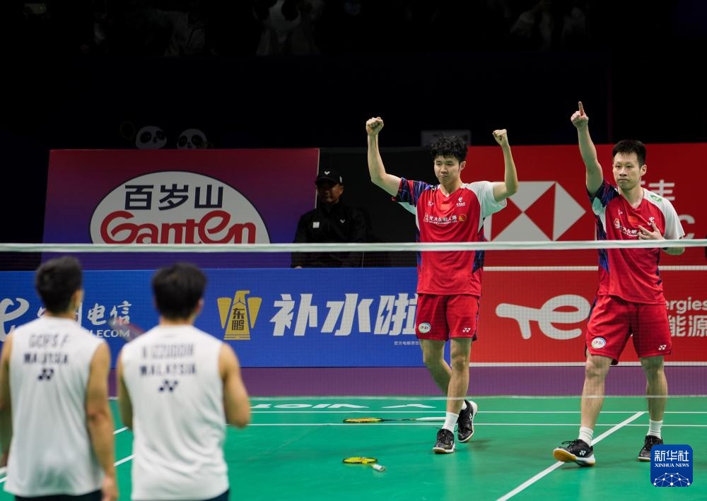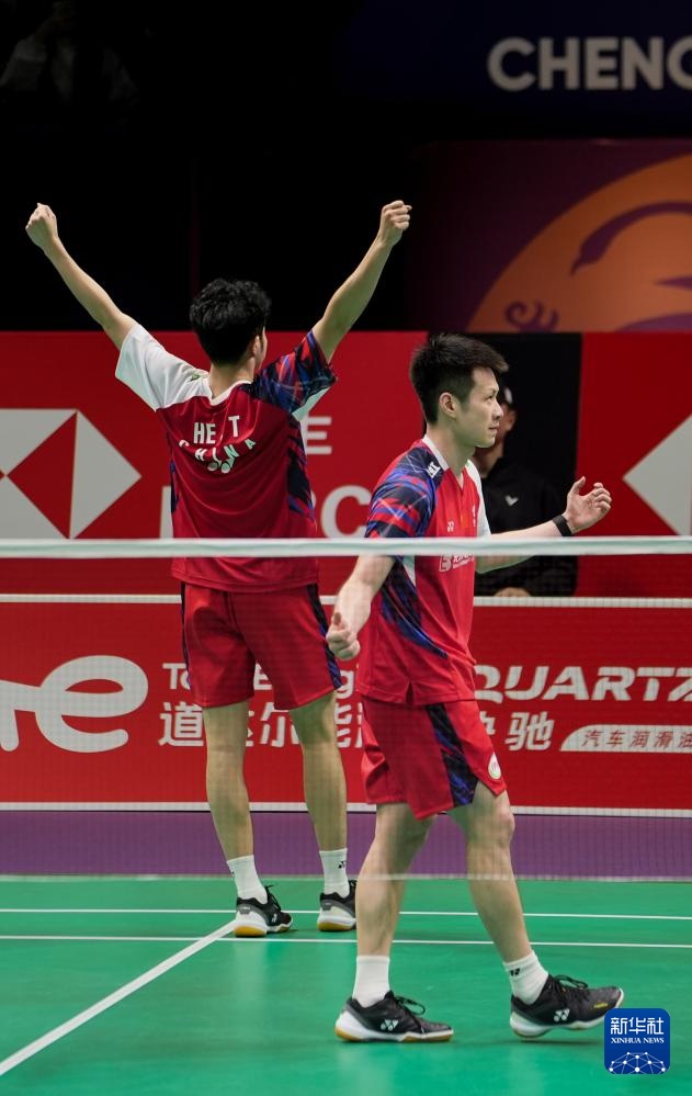 5月4日,中国队组合何济霆(左)/任翔宇在男子双打比赛中庆祝得分。他们2比1战胜马来西亚队组合吴世飞/努·伊祖丁。新华社记者 侯昭康 摄