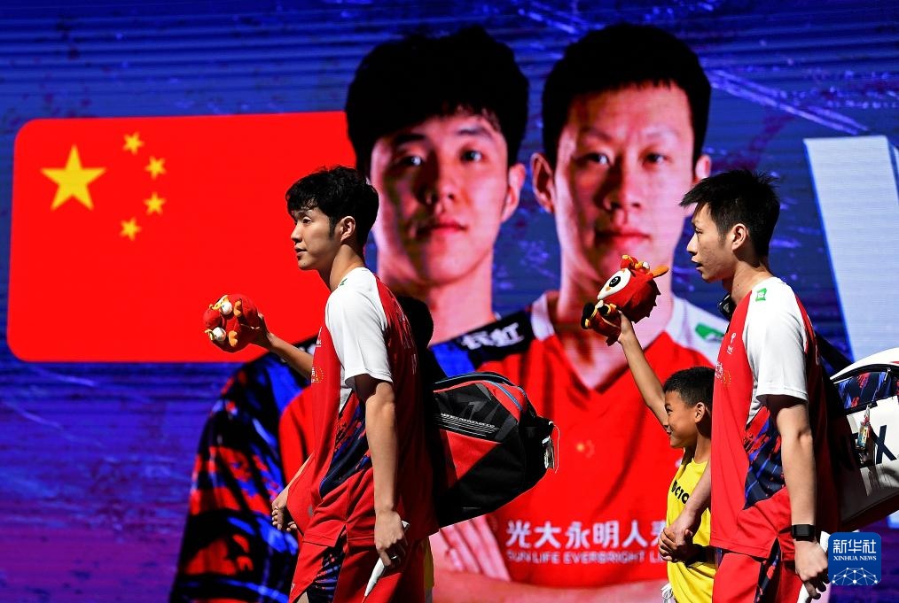 5月4日,中国队组合何济霆(左)/任翔宇在男子双打比赛前入场。他们2比1战胜马来西亚队组合吴世飞/努·伊祖丁。新华社记者 侯昭康 摄