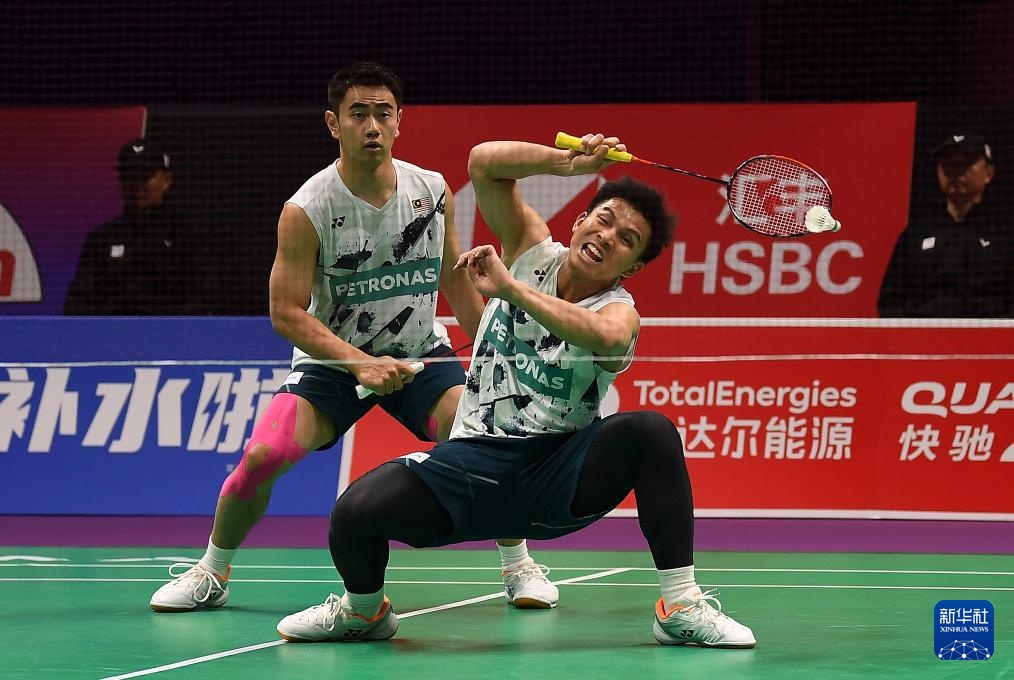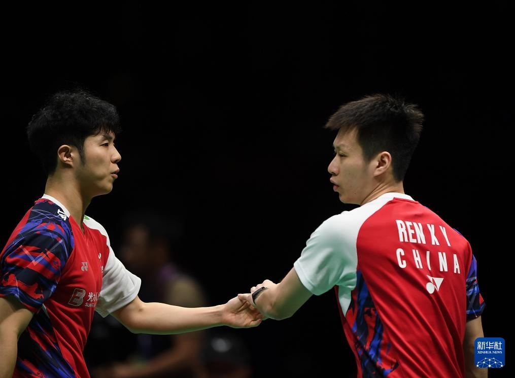 5月4日,中国队组合何济霆/任翔宇(右)在男子双打比赛中。他们2比1战胜马来西亚队组合吴世飞/努·伊祖丁。新华社记者 侯昭康 摄