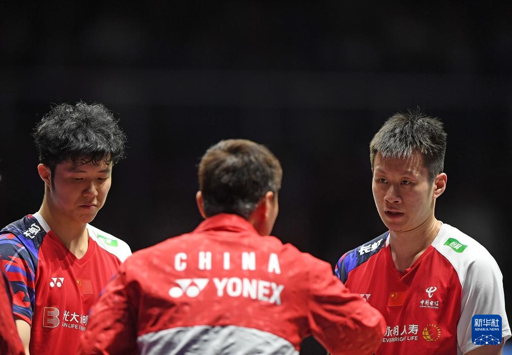 5月4日,中国队组合何济霆(左)/任翔宇(右)在男子双打比赛间隙接受教练指导。他们2比1战胜马来西亚队组合吴世飞/努·伊祖丁。新华社记者 侯昭康 摄