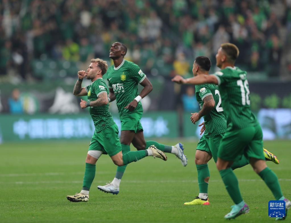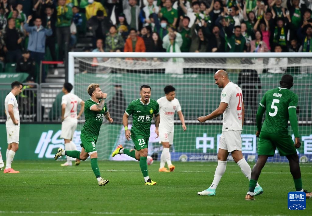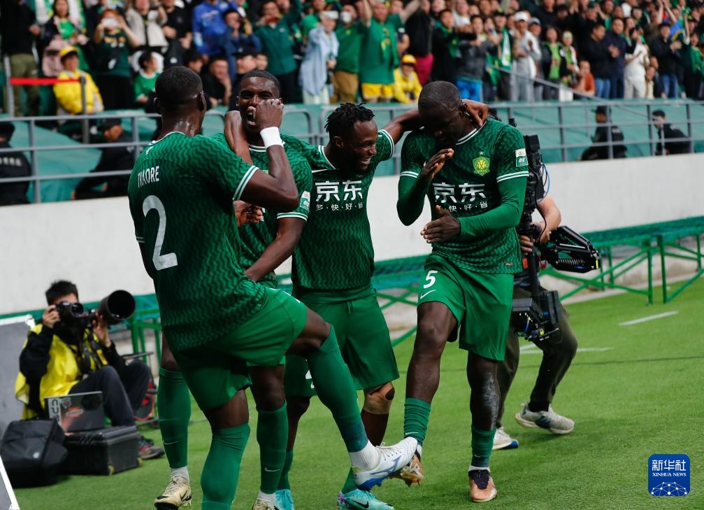 5月5日,北京国安队球员古加(左一)进球后庆祝。新华社记者 胡星宇 摄