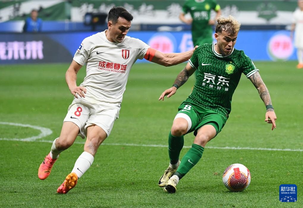 5月5日,北京国安队球员恩加德乌(右)和成都蓉城队球员费利佩在比赛中拼抢。新华社记者 胡星宇 摄