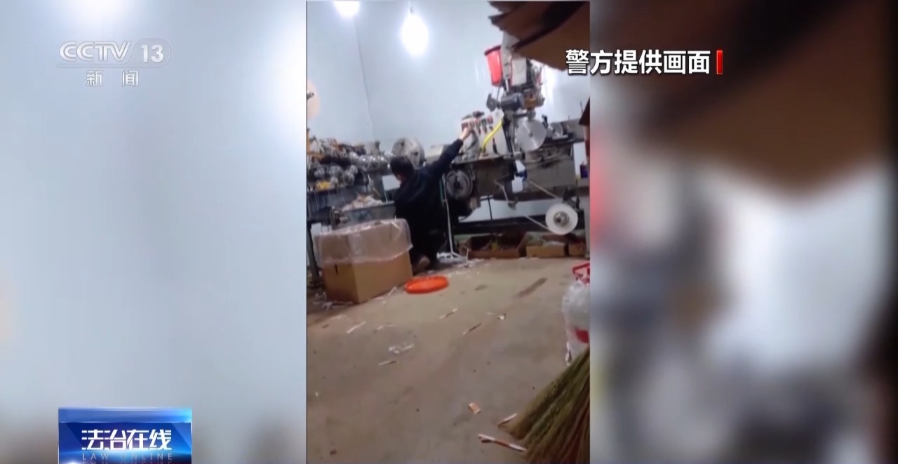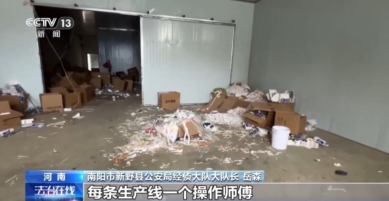 南阳市新野县公安局经侦大队大队长 岳森:这是生产车间,警方来查时这边有个机器,里边那个位置有个机器,这是两条生产线。每条生产线一个操作师傅和五个工人。