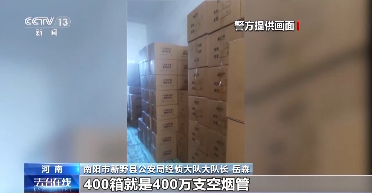 南阳市新野县公安局经侦大队大队长 岳森:两条生产线,每个生产线分白班和夜班,24小时不停在生产。白班就是早上8点到晚上8点,夜班是晚上8点到早上8点,一个班一天就是100箱生产量,如果按两条生产线算,白班、夜班一天就是400箱,400箱就是400万支空烟管。