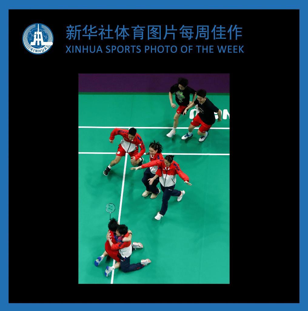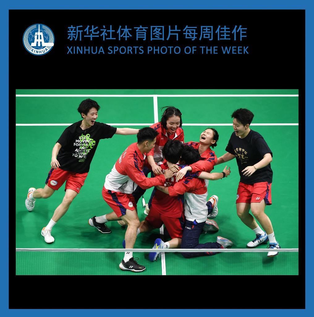 5月5日,中国队选手何冰娇(下左)在女子单打比赛获胜后与队友庆祝。何冰娇2比1战胜印度尼西亚队选手瓦多约。