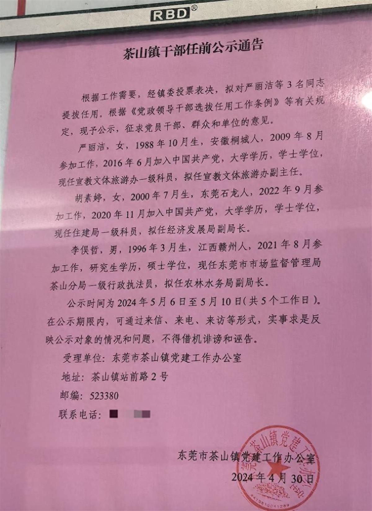 网传的干部任前公示通告称,胡素婷,女,2000年7月生,东莞石龙人,2022年9月参加工作,2020年11月加入中国共产党,大学学历,学士学位,现任住建局一级科员,拟任经济发展局副局长。落款为茶山镇党建办。