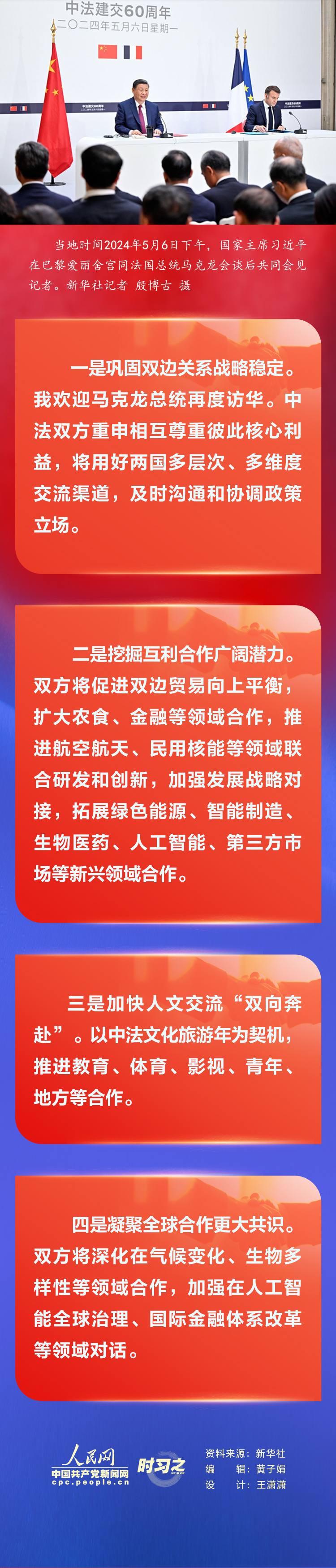 当地时间2024年5月6日下午,国家主席习近平在巴黎爱丽舍宫同法国总统马克龙会谈后共同会见记者。习近平指出,很高兴应马克龙总统邀请,在中法建交60周年之际,再次对法国进行国事访问。我同马克龙总统举行了富有成果的会谈。我们一致认为,中法关系具有珍贵历史、独特价值和重要使命,双方要传好历史的接力棒,弘扬中法建交精神并为其赋予新的时代内涵,开启中法关系下一个60年的新征程。