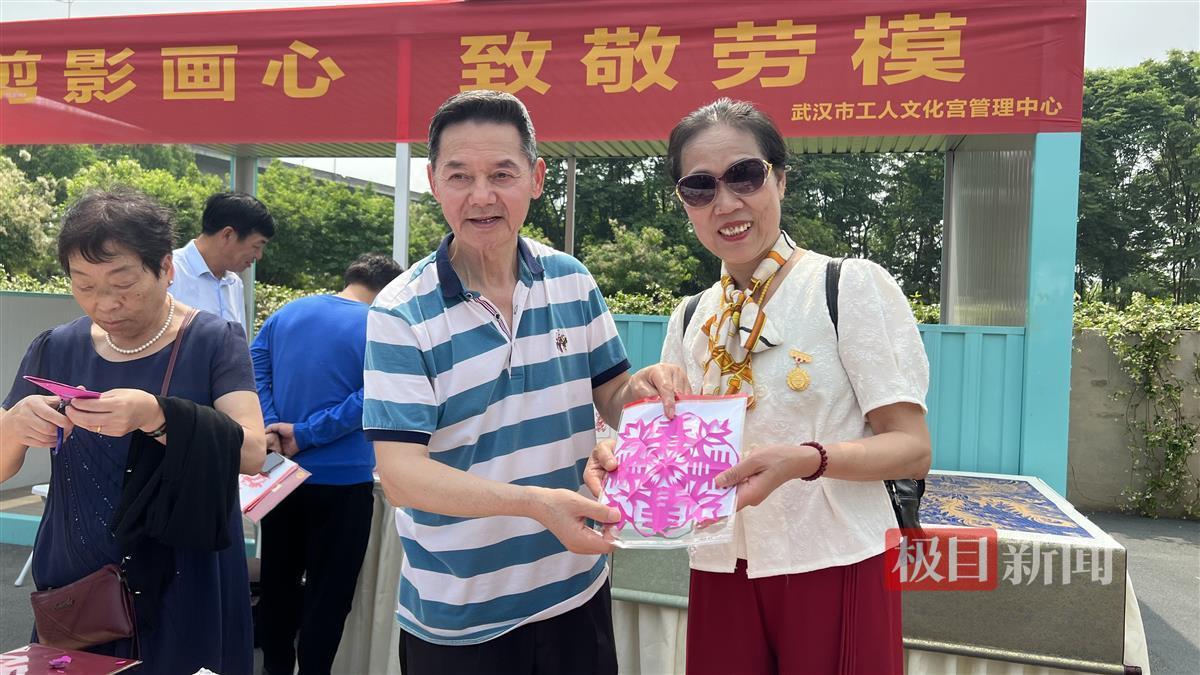 剪纸艺术家向劳模、工匠赠送现场创作作品并合影(极目新闻记者 柳琛琛摄)