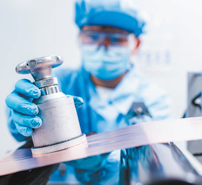 在巴斯夫杉杉电池材料研究院,实验员正在对涂布前的空箔材的面密度进行取样确认。 巴斯夫杉杉电池材料有限公司供图 |