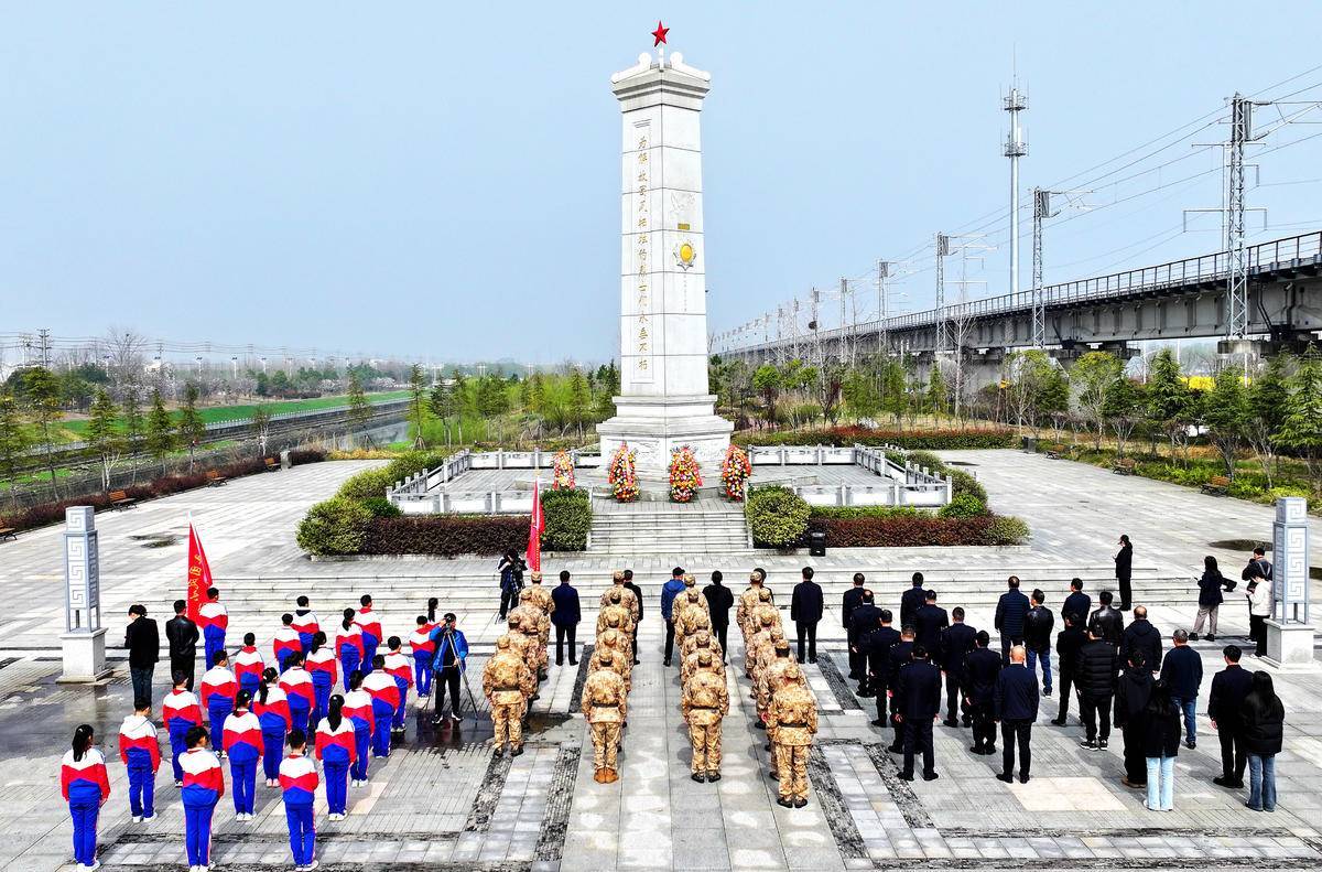 3月19日,黄冈市团风县各界代表来到盘石桥渡江战役烈士陵园敬献花篮。(视界网 周伟 摄)
