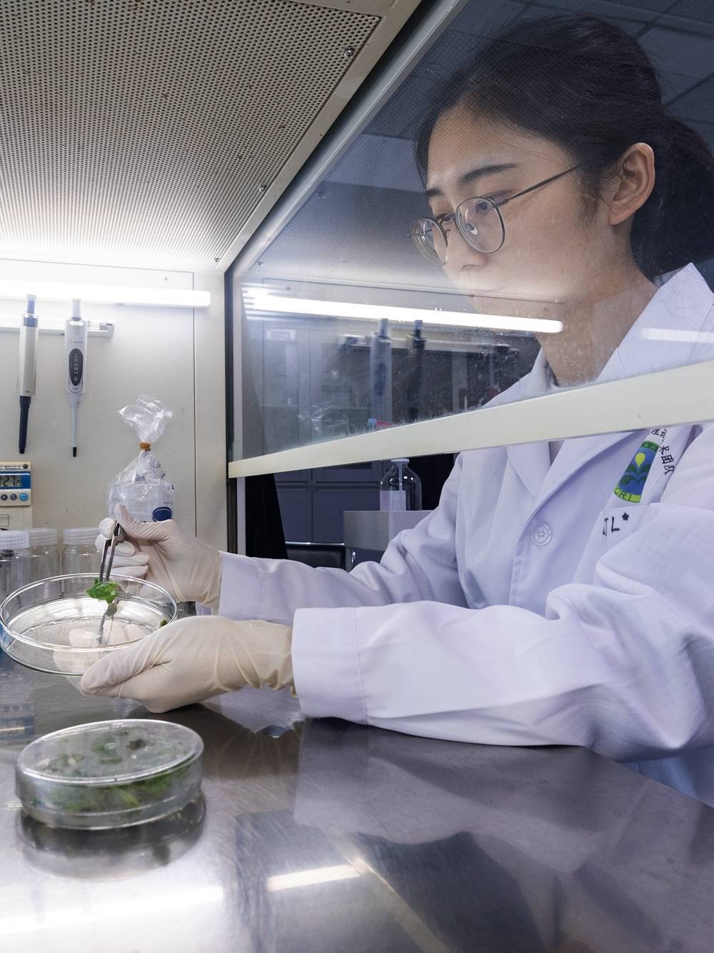 3月19日,在中国农科院油料所实验室内,油料作物分子改良方向科研助理刘婧琳在无菌操作台上进行油菜遗传转化操作。