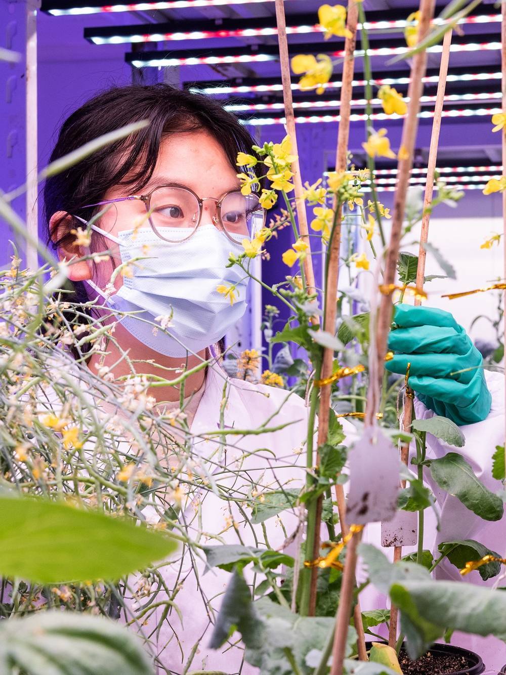 3月18日,在中国农科院油料所的智能人工气候室内,油菜抗逆方向研究生李一林正在对油菜植株进行杂交操作。