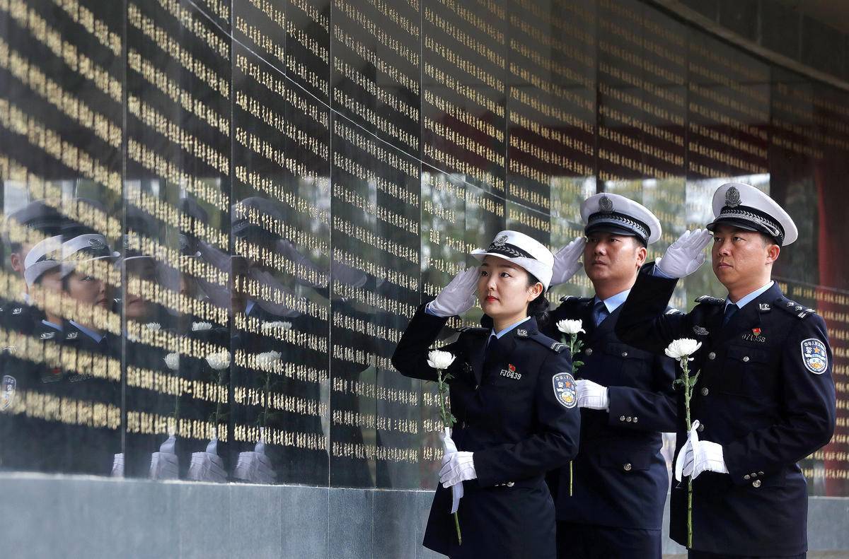 4月2日,荆门市公安局交警支队民警向革命烈士致敬。(视界网 赵平 摄)