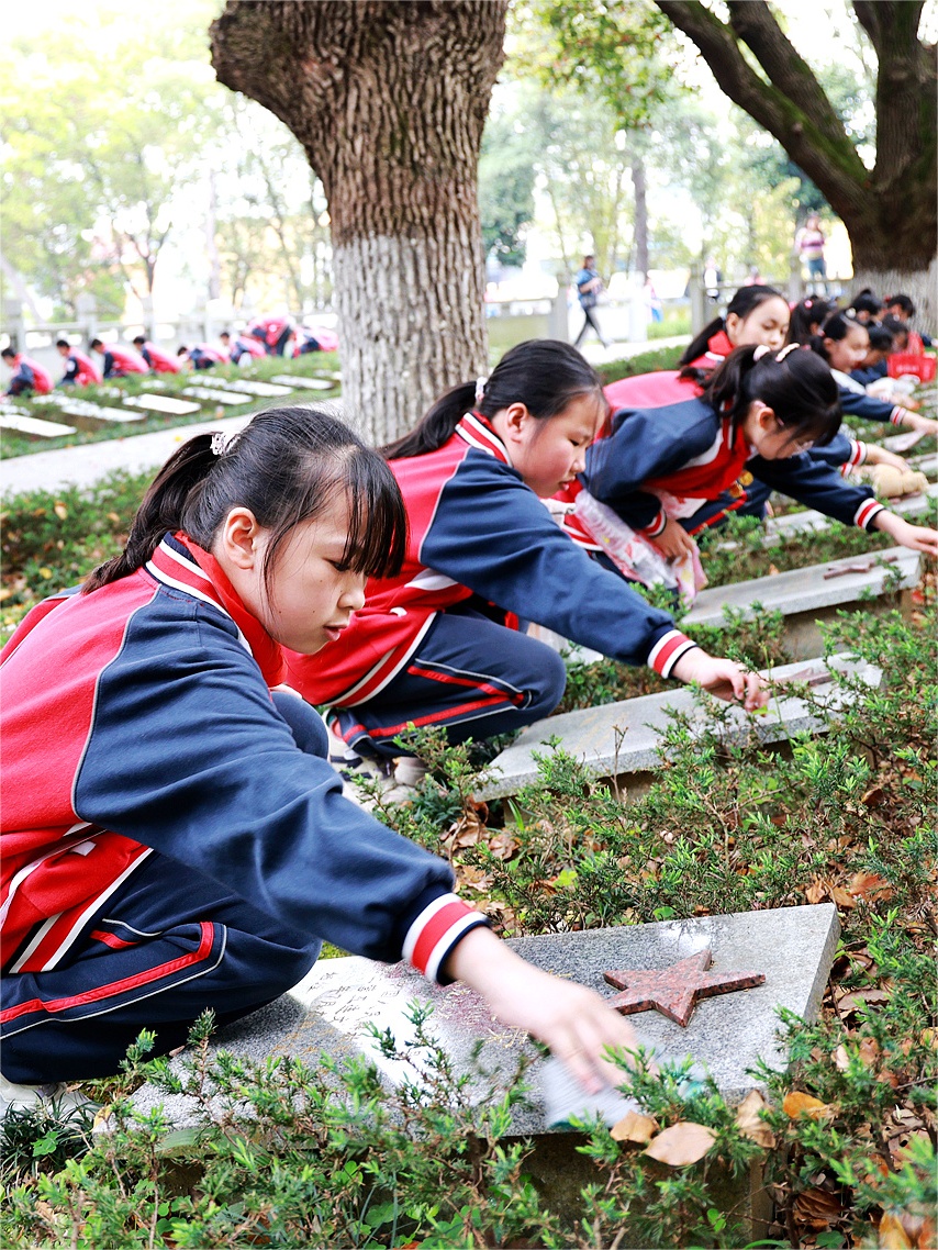 4月3日,宜昌市西陵区铁路坝小学教联体东方红校区的少先队员来到东山烈士陵园,擦拭烈士墓碑,表达对英烈的敬意。(视界网 黄翔 摄)