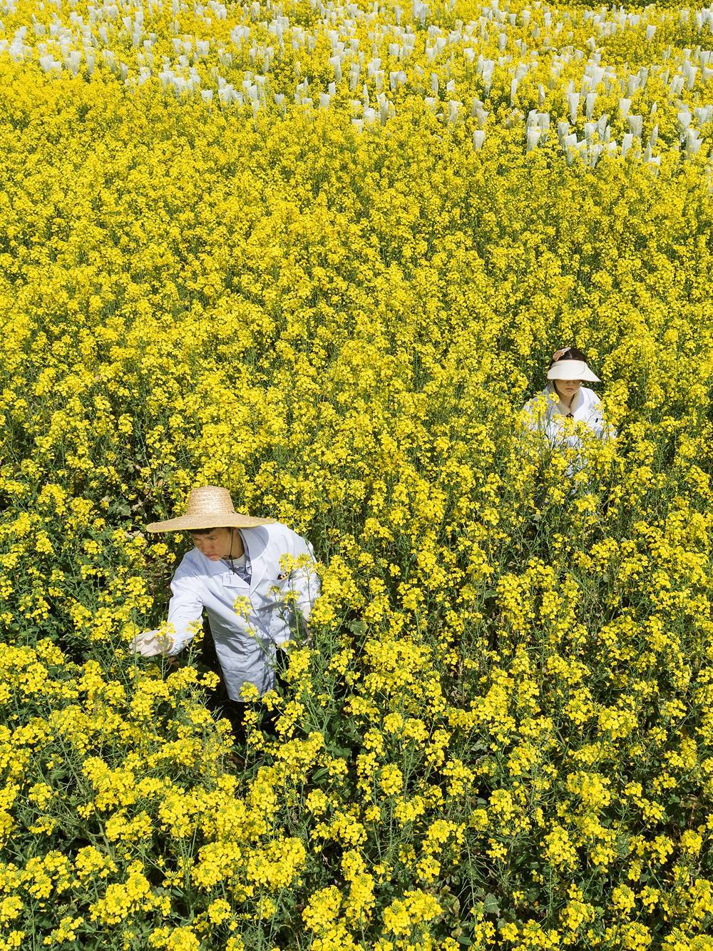 科研人员们却无暇欣赏美景。油菜花期也是杂交授粉的关键期,他们每天“泡”在花田中,观察记录、选择单株、挂牌套袋,忙碌不已。