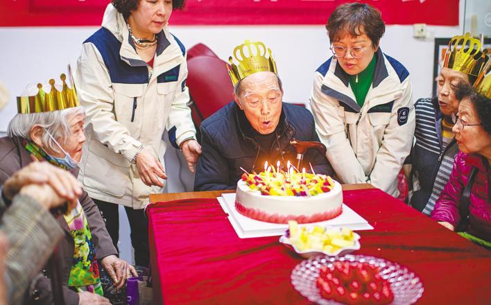 社区工作人员、照护师将老人们请到座位上,并给他们戴上生日帽。在欢快的《生日快乐》歌曲旋律中,工作人员围着“老寿星们”唱着生日歌,100岁的黄啟知爷爷代表大家许愿、吹蜡烛、切生日蛋糕。老人们吃着蛋糕,话着家常,脸上绽放出幸福的笑容。