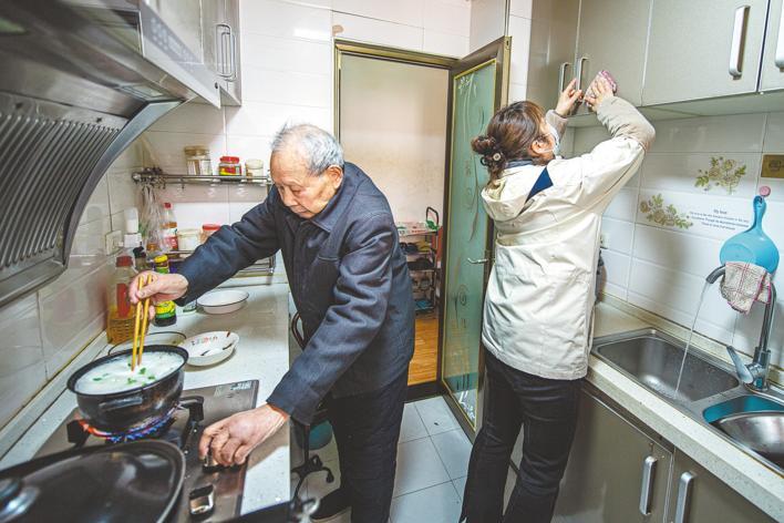 3月7日,吴益寿老人在家煮面条,照护师徐秋红在做卫生。(湖北日报全媒记者 朱熙勇 摄)